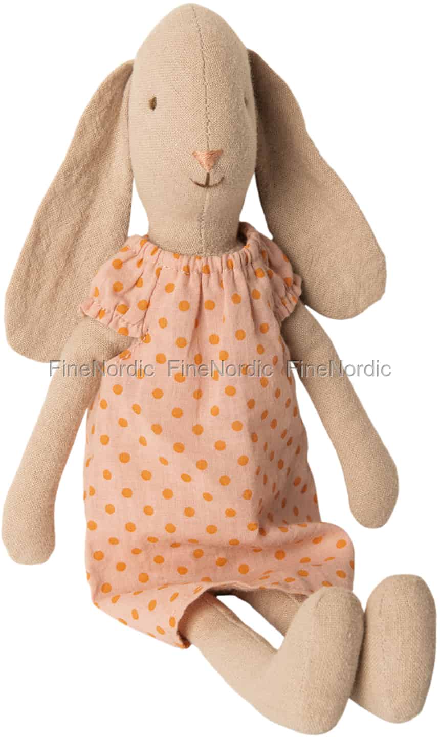 Schauen Sie sich doch mal dieses charmante Maileg Häschen in Größe 2 an, welches ein äußerst hübsches, gepunktetes Nachthemd trägt. Die Maileg Hasen sind eine fröhliche Truppe und wenn Sie sie sich genau ansehen, können Sie sehen, dass sie immer ein fröhliches Lächeln auf ihren niedlichen, kleinen Hasengesichtern tragen. Genau wie dieses kleine süße Häschen. Mit ihr hat man viel Spaß beim Spielen und kann abends im Bettchen gut mir ihr kuscheln. Sie ist eine treue Begleiterin und ihr Kind kann sie überall hin mitnehmen. Sollte sie während eines Ihrer Ausflüge schmutzig werden, können Sie sie einfach bei 30 ° C in der Waschmaschine waschen. Möchten Sie mehr als nur eine Spielkameradin für Ihr Kind haben? Dann werfen Sie doch mal einen Blick auf die große Auswahl an Maileg Häschen, die wir in unserem Webshop anzubieten haben.