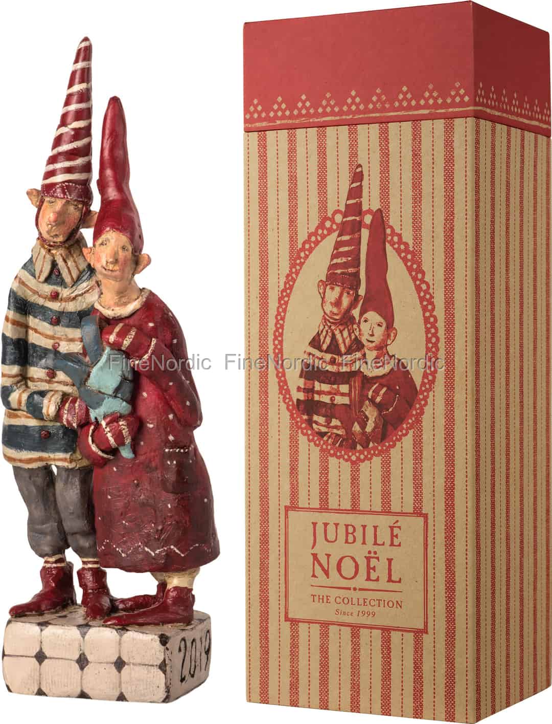 Das Maileg Jubilé Noël Weihnachtswichtel Pärchen ist eine schöne Ergänzung für Ihre Maileg Sammlung. Er trägt einen gestreiften, spitzen Wichtelhut, eine gestreifte Jacke und rote Stiefel und sie trägt einen roten, spitzen Wichtelhut, einen roten Mantel und auch rote Stiefel. Sie lehnt sich ganz vertraut an ihn, während sie ein blaues, geflochtenes Herz in den Händen hält. Die zwei stehen auf einem karierten Sockel, auf der, an der Seite, die Jahreszahl 2019 zu lesen ist. Sie können also mit diesem charmanten Paar Ihre eigene Sammlung ergänzen oder es ist auch eine schöne Geschenkidee für einen Maileg Sammler. Die zwei Figuren werden in einer schönen Geschenkbox geliefert.
