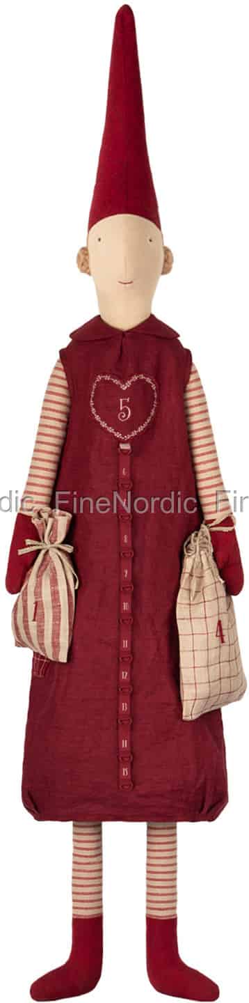 Mailegs Kalender Wichtel Mädchen 2018 hilft Ihnen, die Tage bis Weihnachten zu zählen. An dem Wichtelmädchen sind 24 Ringe angebracht, an denen Sie kleine Geschenke anhängen können. Ab dem 1. Dezember kann ein Kind dann jeden Morgen eine kleine Überraschung öffnen. Das macht das lange Warten bis Weihnachten viel einfacher. Das Maileg Kalender Wichtel Mädchen 2018 ist 1,26 m groß, von der Spitze ihres roten Wichtelhutes bis runter zu ihren, mit roten Strümpfen bedeckten, Füßen. Sie trägt ein rotes, ärmelloses Kleid, bestickt mit einem großen Herzen, in dessen Mitte die Nummer 5 steht. Das Maileg Kalender Wichtel Mädchen 2018 ist eine fantastische Weihnachtsdekoration und ein wunderschöner Adventskalender für einen geliebten Menschen.
