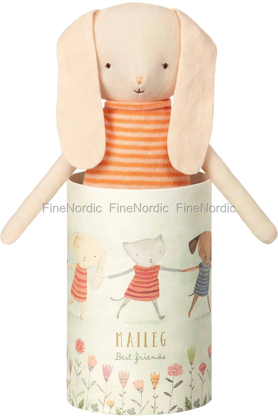 Was könnte sich denn wohl in dieser Box versteckt haben? Oh, es ist ein süßes Maileg Best Friends Kaninchen, welches aus der Box guckt. Das kleine Kaninchen trägt ein gestreiftes Hemd und ein schüchternes kleines Lächeln auf den Lippen. Es kuschelt und spielt gerne und kuschelt dann gerne noch ein bisschen mehr. Das Kaninchen ist eine schöne Geschenkidee für einen kleinen Jungen oder ein kleines Mädchen und wie praktisch, dass es bereits in einer entzückenden Geschenkbox geliefert wird.