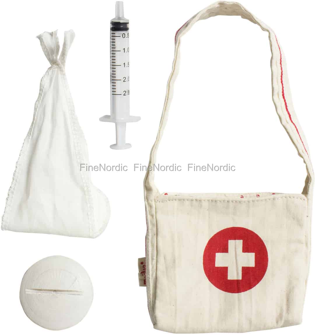 In der Maileg Erste Hilfe Tasche ist alles drin, was man für einen echten Hasennotfall braucht: Spritze, Tablette und Armschlinge, alles vorhanden! So ist man immer bestens vorbereitet, falls sich ein Häschen beim Spielen mal wehtut. Die Erste Hilfe Tasche ist dank des großen Henkels sehr einfach zu tragen und mit dem Kreuz auf der Vorderseite weiß jeder sofort, dass es sich um eine Erste Hilfe Tasche handelt.