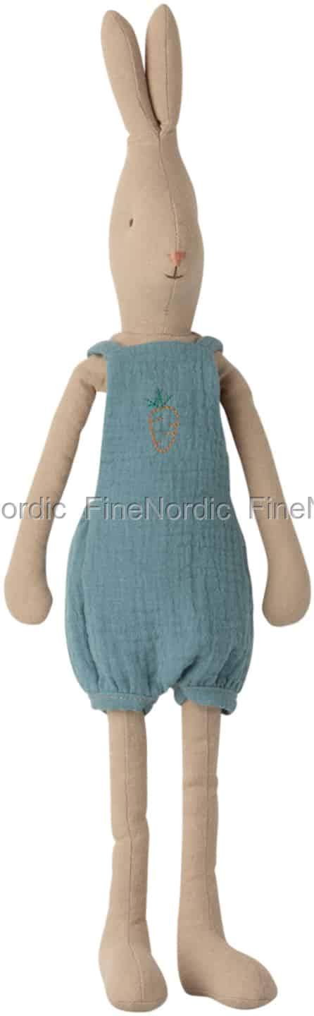 Was denkst du, was das Lieblingsessen dieses Kaninchens sein könnte? Genau, Karotten! Karottenbrei zum Frühstück, Karottensuppe zum Mittagessen und Karottensalat zum Abendessen und am besten dann noch Karottenkuchen zum Nachtisch. Das Maileg Kaninchen trägt sein Lieblingsoutfit mit einer hübschen, gestickten Karotte darauf. Der bläuliche Overall besteht aus weicher Baumwolle und kann bei 30 ° C in der Maschine gewaschen werden. Die Ohren des Maileg Kaninchens sind nach oben gestellt, sodass es den Ruf seiner Mutter nicht verpasst, wenn das Essen fertig ist. Dieses charmante Größe 3 Kaninchen ist ein wunderbarer Spielgefährte für einen kleinen Jungen oder ein kleines Mädchen, sowie eine schöne Dekoration für ein Kinderzimmer.