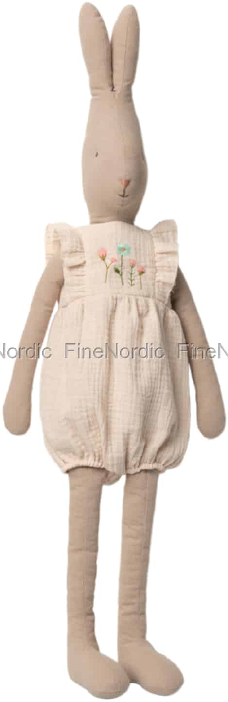 Dieses Größe 5 Maileg Kaninchen trägt seinen Lieblingsjumpsuit. Der cremefarbene, ärmel- und hosenbeinlose Strampler ist mit einer wunderschönen Blumenstickerei verziert und hat entzückende Rüschen. Die Maileg Kaninchenkleidung Kollektion besteht aus weichem Leinen und Baumwolle und die Outfits können bei 30 ° C in der Maschine gewaschen werden. Die Ohren des Kaninchens sind ganz hochgestellt, womit es eine beeindruckende Höhe von 75 cm hat. Das Kaninchen ist ein wunderbarer Spielgefährte für ein Kind sowie eine charmante Dekoration für das Zimmer eines kleinen Kindes. Schauen Sie sich gerne mal die vielen Maileg Kaninchen und Hasen an, die wir in unserem Webshop anbieten. Einer ist niedlicher als der andere, was es wirklich schwierig macht, einen auszuwählen.