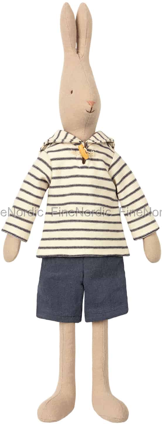 I am sai-ling, I am sai-ling, singt der Maileg Kaninchenjunge, während er auf einem Dreimastschoner über die Badewanne schwimmt. In der Maileg-Welt kannst Du so tun, als würdest Du eine Reise über das Meer antreten und Deiner Fantasie freien Lauf lassen. Dieser Maileg Seemann trägt ein gestreiftes Matrosenhemd und einfarbige Shorts und ist bereit für stundenlanges Spielen und Abenteuer. Er ist eine wunderbare Geschenkidee für einen Maileg Sammler.
