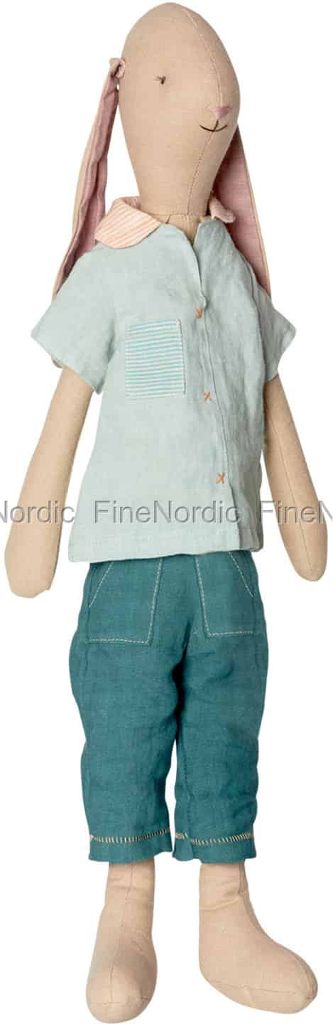 Maxi Rabbit Jacob, ein Maileg Hase mit Stil. Vom pfirsichfarbenen Kragen, bis runter zu der feschen Leinenhose, einfach todschick. Gerne probiert er auch die andere trendige Kleidung von der Maileg Maxi Kollektion an. Er liebt es zu spielen und viel Spaß zu haben. Beim draußen spielen braucht er sich keine Gedanken zu machen, ob er mal schmutzig wird, denn man kann ihn und die Kleidung einfach auf 30 C waschen. Ein lieber Spielkamerad mit Stil: Das ist Mailegs Maxi Hase Jacob.