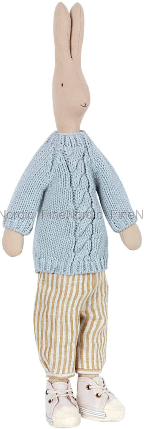 Der Maileg Medium Hase Janus ist ein fesches Kerlchen. Immer schick angezogen ist er für jeden Schabernack bereit. Er lauscht aufmerksam mit seinen hochgestellten Ohren, dem, was um ihn herum erzählt wird und passiert. Er unternimmt gerne Ausflüge und ist der amtierende 1000 m Hoppelweltmeister. Er achtet sehr auf gute Ernährung und Möhren und Kraut stehen bei ihm ganz oben auf der Speiseliste. Er ist ein geselliger Hasenjunge, der gerne einen Spielkameraden finden möchte. Kennen Sie da vielleicht jemand?