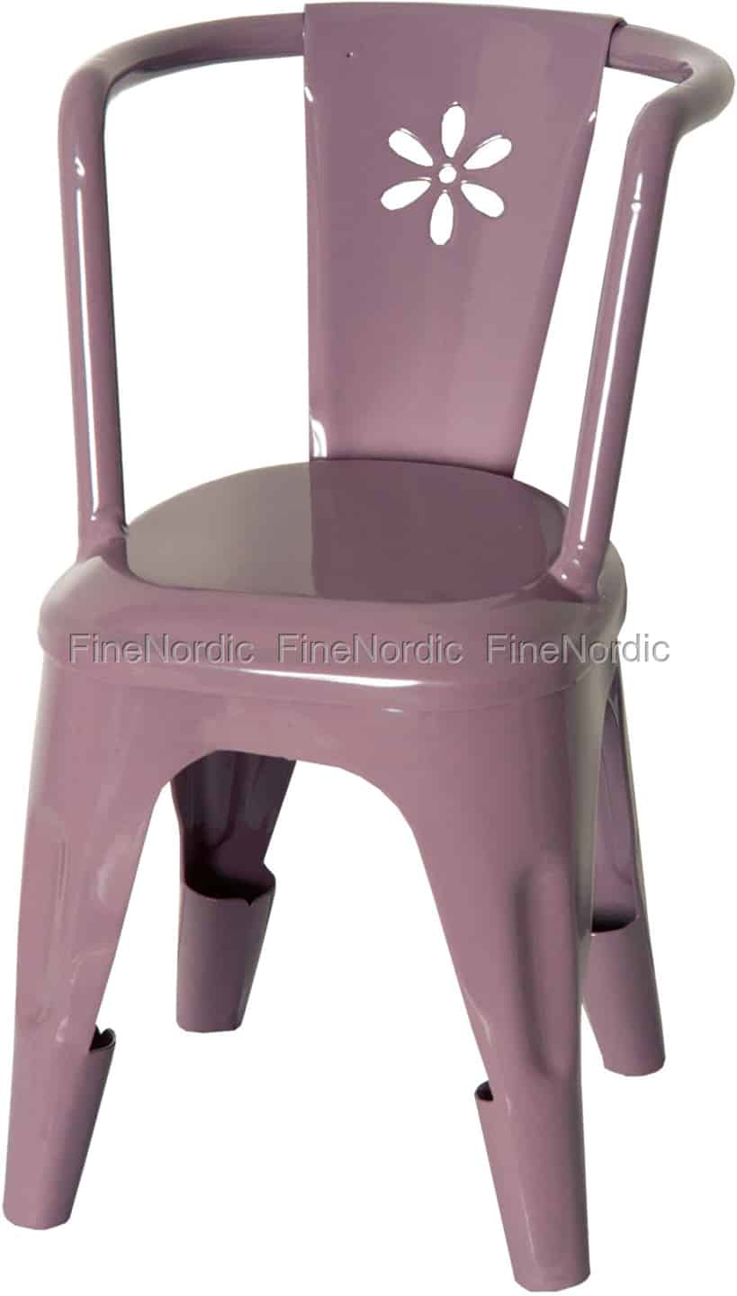 Hübscher Metallstuhl in einem lilafarbenen Ton in angesagten Tolix-Look für Maileg Kaninchen.