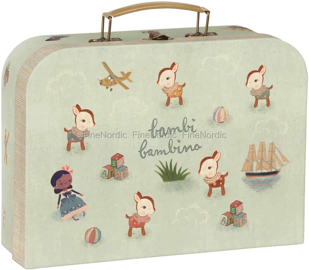 Dieser Maileg Bambi Bambino Koffer ist einfach bezaubernd, egal von welcher Seite Sie ihn anschauen. Die Vorderseite zeigt niedliche Bambis in verschiedenfarbigen gepunkteten Outfits, ein kleines Mädchen in einem blauen Kleid, ein Segelboot, zwei gestreifte Bälle, einen Stapel Würfel mit Buchstaben und ein kleines Sportflugzeug. Auf der Rückseite des Koffers sehen Sie ein Bambi, und an der Seite des Koffers sehen Sie mehr von den Illustrationen, die vorne auch abgebildet sind. Wenn Sie den Koffer öffnen, werden Sie feststellen, dass das Innere mit fröhlichen Pünktchen bedeckt ist. Der Koffer ist 26 cm breit, 19 cm hoch und 8 cm tief. Packe dein Lieblingsspielzeug ein und besuche einen kleinen Freund oder lege deinen Schlafanzug hinein und schon bist du startklar für einen Übernachtungsbesuch bei Oma. Der Bambi Bambino Koffer ist auch eine schöne Geschenkidee für einen kleinen Maileg Fan.