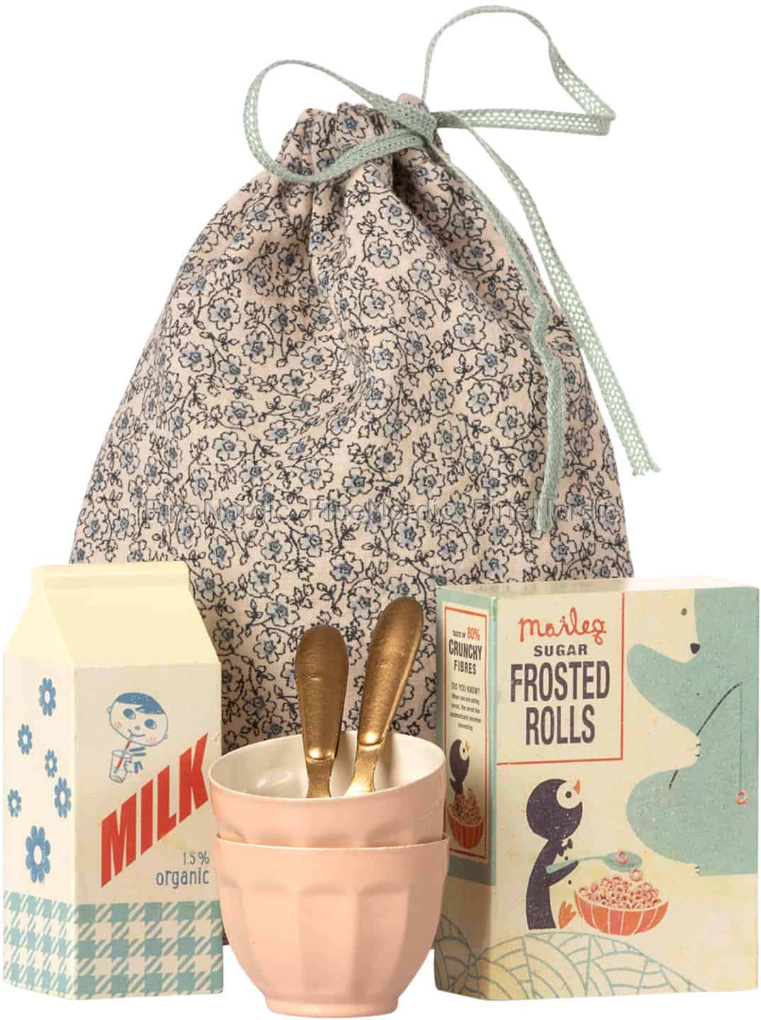 Maileg Hasen essen nicht nur gerne Karotten, sondern zum Frühstück auch gerne mal Müsli! Das bezaubernde Maileg Frühstücksset für zwei Personen wird in einem hübschen Blumensack mit zwei Schüsseln und Löffeln, einer Schachtel Frosted Rolls und einem Karton Milch geliefert. Nehmt doch einfach Platz und genießt eine köstliche Schüssel Müsli. Ihr könnt über Eure Träume von der letzten Nacht reden erzählen, was ihr so für den Tag geplant haben. Mit einem leckeren Maileg Frühstück startet man am allerbesten in den Tag.