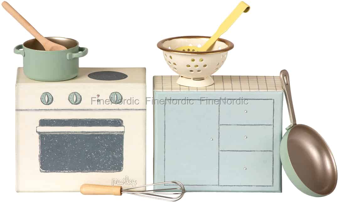 Dieses Kochset wird in einer Herd Box geliefert und so kann Ihr Kind die Box während des Spielens gleich als Herd nutzen. Kochen Sie mit Ihrem Kind ein imaginäres Abendessen oder laden Sie noch andere kleine Freunde zu einer großen Kochparty ein. Das Kochset beinhaltet einen Topf, eine Pfanne, ein Sieb und Küchenutensilien. Dieses unterhaltsame und originelle Set ist ein ideales Geschenk für einen kleinen Meisterkoch. Die Maileg Spielzeuge helfen einem Kind beim Entwickeln von Kreativität und Verstand und auch um die Hand-Augen-Koordination zu trainieren. Wir haben eine große Menge Maileg Kaninchen Zubehör in unserem Webshop, sodass die Spielzeit Ihres Kindes noch zauberhafter sein wird.