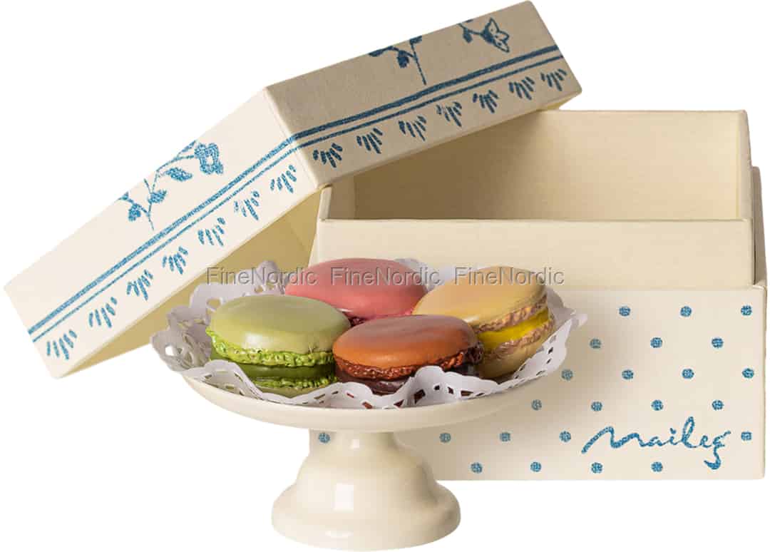 Warum eigentlich immer Tee Party? Feier doch mal zur Abwechslung eine Kakao Party mit Deinen Lieblingskaninchen und serviere ihnen ein paar Makronen, welche ihr dann zusammen mit dem Kakao genießen könnt! Wir sind sicher, die Kaninchen werden begeistert sein! Leg diese lecker aussehenden Makronen einfach auf den schönen, handbemalten Kuchenständer und präsentiere sie so Deinen Gästen. Bald schon kann man aus dem Kinderzimmer lautes Geplapper, Gelächter und Kau- und Schlürfgeräusche hören. Die Macaroons et Chocolat Chaud von Maileg werden in einer dekorierten Schachtel geliefert. Es ist ein hübsches Kaninchen-Zubehör, um das Spielen noch interessanter zu gestalten. Schau Dir gerne mal all das viele Kaninchen-Zubehör an, welches wir in unserem Webshop anbieten.