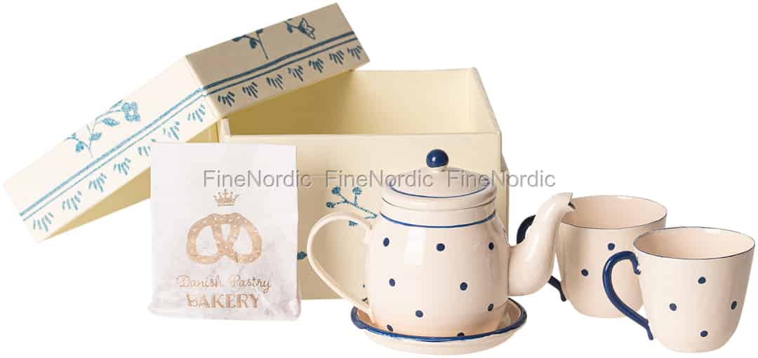 Was finden wir wohl in dieser hübsch dekorierten Schachtel vor? Fast alles, was Du für einen schönen Nachmittagstee mit Deinem Maileg Lieblingskaninchen brauchst. Mach mal eine kurze Pause für ein Kind-zu-Kaninchen Gespräch, für eine schöne Tasse Tee und vielleicht dazu noch einen Keks? Das Maileg Tea & Biscuits für Zwei Kaninchen-Zubehör lässt Dein Spielen noch realer und authentischer aussehen. Es ist ein schönes Geschenk für einen kleinen Maileg Fan.