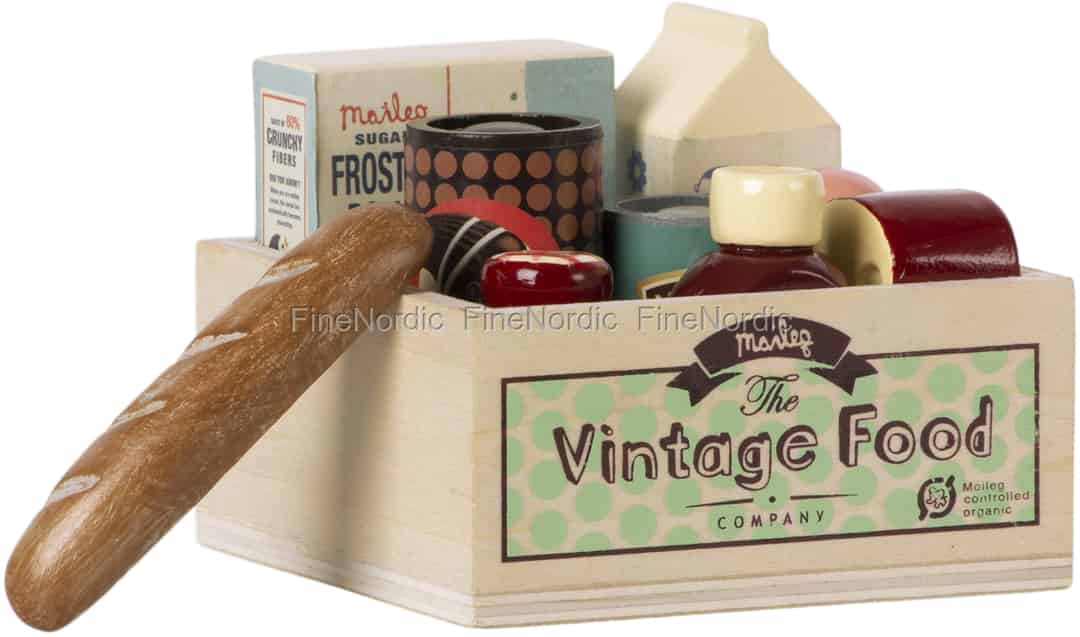 Die Vintage Food Lebensmittelbox ist ein charmantes Accessoire aus dem Hause Maileg. Die quadratische Kiste ist mit einer Dose Baked Beans, Kaffee, Brot, Senf, Ketchup, Müsli, Wurst, Käse und einem Tetra Pak Milch befüllt. Sie enthält also quasi viele leckeren Lebensmittelartikel, die Du und Deine Maileg Freunde sich nur wünschen können. Mit diesen fantastischen Essensprodukten kannst Du ein kleines Picknick veranstalten oder ein damit Kaufmannsladen spielen. Die Vintage Food Lebensmittelbox ist eines der vielen Maileg Accessoires, die wir in unserem Webshop anbieten. Sie verschönen das Spielen Ihrer Kinder und lassen sie noch einfallsreicher und kreativer sein.