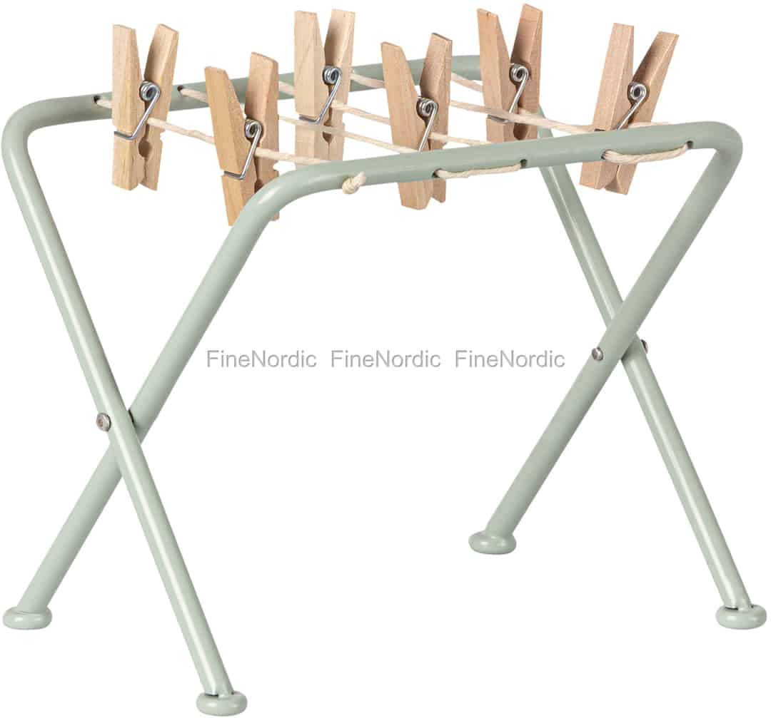 Der Maileg Wäscheständer mit Wäscheklammern sorgt dafür, dass die Mäuse und Hasen einen Platz haben, an dem sie ihre Wäsche zum Trocknen aufhängen können. Du kannst den Ständer ganz einfach aufklappen und die Wäsche mit den Holzklammern aufhängen, und schon sind sie in nur kürzester Zeit wieder trocken. Wenn danach auch gebügelt werden soll, dann schau Dir doch auch mal das Maileg Bügeleisen und Bügelbrett an, welche wir auch in unserem Webshop anbieten. Der Waschtag hat noch nie so viel Spaß gemacht wie jetzt!