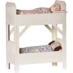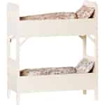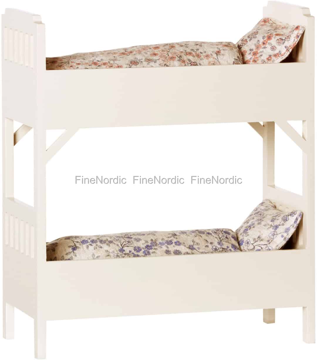 Die Maileg Kaninchen lieben es tagsüber zu spielen und viel Spaß zu haben, aber sobald die Sonne untergeht, sind sie bereit, in das Heiabettchen zu hoppeln. Sie lieben Etagenbetten, denn das bedeutet, dass Sie immer noch ein Kaninchen mit im Zimmer haben können. So ist dann jemand da, mit dem sie über den vergangenen, unterhaltsamen Tag reden können und mit dem sie sich gegenseitig Gute Nacht Geschichten erzählen können. Dann wäre ja vorher nur noch eins zu klären: Wer schläft oben und wer schläft unten? Mailegs kleines Etagenbett in cremefarben wird mit zwei blumigen Kissen und Decken geliefert. Das Etagenbett ist auch in einer größeren, schwarzen Version in unserem Webshop erhältlich.