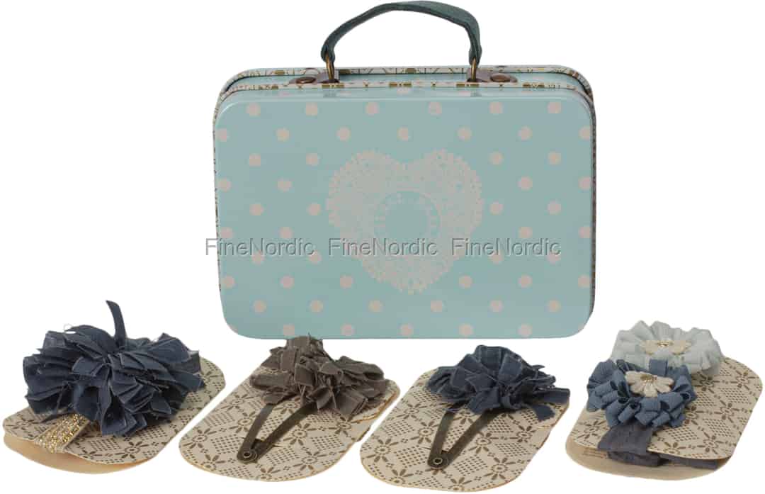 Das Kinderhaarschmuck Geschenkset Blau von Maileg wird in einem blauen Metallkoffer geliefert, der mit weißen Punkten und einem Herzen bedeckt ist. Die Worte „Original Maileg“ sind in der Mitte des Herzens zu sehen, sodass kein Zweifel daran besteht, aus welchem Hause dieses schöne Geschenkset stammt. Haarschmuck, wie Haarspangen und Haarbänder, schmücken die Frisur eines Kindes ungemein und helfen auch oft dabei, das viele Haar unter Kontrolle zu halten. Dieser gut aussehende Maileg Haarschmuck macht genau das. Dieses Geschenkset, bestehend aus verschiedenem Haarschmuck, ist ein schönes Geburtstagsgeschenk für ein kleines Kind, welches ein wenig Hilfe bei der Zähmung seiner Haare gut gebrauchen könnte.