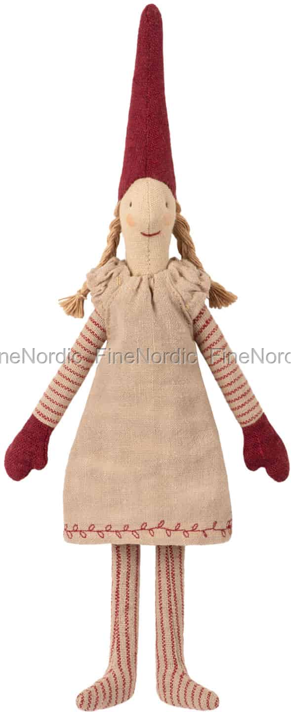 Hier ist ein weiterer 2018 Maileg Kletterwichtel. Wichtel B liebt es, mit ihren magnetischen Händen zu klettern. Legen Sie einfach die beiden Hände zusammen und die Magnete halten sie fest. Jetzt kann sie an einem Ast, einer Stange oder einer Leiter hängen oder wo auch immer Sie sie gerne haben möchten. Sie trägt einen roten, spitzen Hut, ein hübsches Kleid und rot-gestreifte Ärmel und Strümpfe schauen unter dem Kleid hervor. Ihr Haar ist in zwei Zöpfen geflochten und sie hat ein glückliches Lächeln in Gesicht. Ihre Wangen sehen ein wenig gerötet aus, aber vielleicht liegt das daran, dass die Weihnachtszeit so aufregend ist und um sie herum so viel los ist und viele Geheimnisse in der Luft liegen. Geschenke einpacken und verstecken, leckere Sachen in der Küche backen, das Haus dekorieren, all das sind Zeichen, dass schon bald Weihnachten ist. Dieser Maileg Kletterwichtel ist eine entzückende Weihnachtsdekoration und ein schönes Geschenk für einen Maileg Wichtel Sammler.
