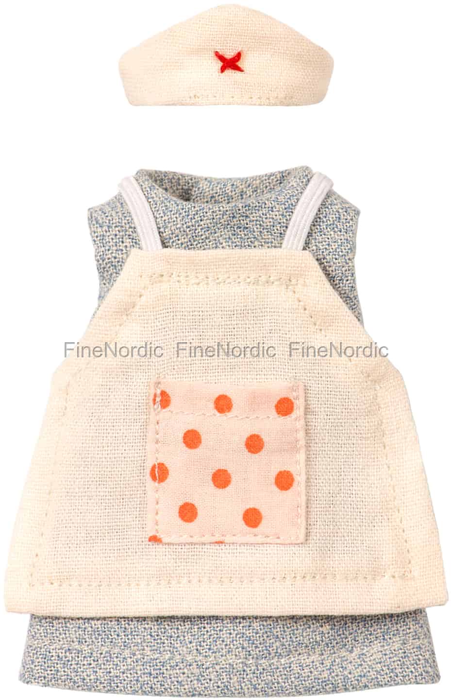 Wir finden es ist eine wirklich gute Idee, wenn Mailegs Krankenschwester Maus mehr als nur ein Krankenschwester Outfit besitzt. Denn so kann sie diese Krankenschwesterkleidung anziehen, wenn das andere Set schmutzig ist oder voller Falten ist. Denn man weiß ja nie wann der Krankenschwesterhut, die Schürze oder das Kleid der Krankenschwester beschmutzt wird? Mit dieser Krankenschwesterkleidung sieht die Maus immer professionell aus und sie ist passend angezogen und bereit, einen weiteren Mäusepatienten zu versorgen.