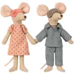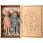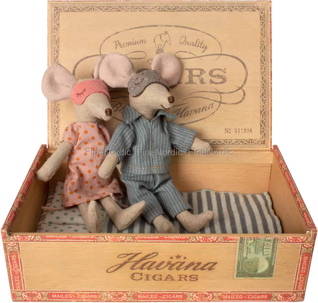 Können Sie auch ein paar leise Schnarchgeräusche aus dieser Zigarrenschachtel hören? Das liegt bestimmt daran, dass Mailegs Mama und Papa Mäuse noch immer in ihrer bequemen Zigarrenschachtel am Schlafen sind. Wenn Sie die Schachtel vorsichtig öffnen, können Sie sie dort, gekleidet in ihrer Nachtwäsche und mit ihren Schlafmasken auf, liegen sehen. Sie sind in eine gestreifte Decke gehüllt und ihre Köpfe liegen auf gepunkteten Kissen. Papa Maus hat einen gestreiften Pyjama an und die Mama Maus trägt ein gepunktetes Nachtkleid. Oh, aber jetzt haben sie uns wohl doch gehört, denn nun ziehen sie ihre Schlafmasken ab und blinzeln mit ihren kleinen Mäuseäuglein und versuchen sich an das helle Licht zu gewöhnen. Nun können die Mama und Papa Mäuse ihren Tag beginnen. Mailegs Mama und Papa Mäuse in der Zigarrenschachtel 2019 sind ein schönes Geschenk für begeisterte Maileg Fans und Sammler.