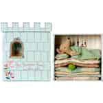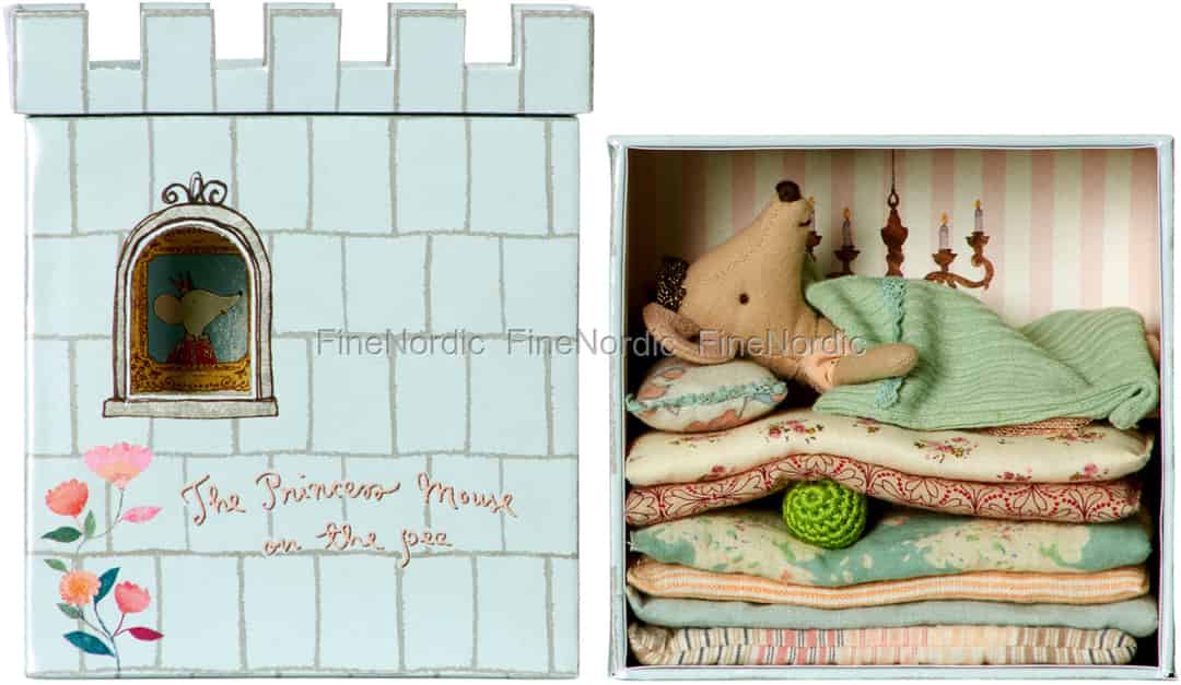 Die Prinzessin auf der Erbse von Maileg ist eine süße kleine Maus Prinzessin, die in einer Burgkiste wohnt. Diese Burgkiste kann auf- und zugeschoben werden und dort kann man die hübsch gekleidete Maus Prinzessin auf vielen Matratzen gebettet liegen sehen. Aber gut schlafen kann sie nicht, denn unter einer der Matratzen liegt eine Erbse und als Prinzessin ist man da sehr empfindlich und spürt natürlich sofort die kleine Hülsenfrucht. Hans Christian Andersen in Maileg Stil!