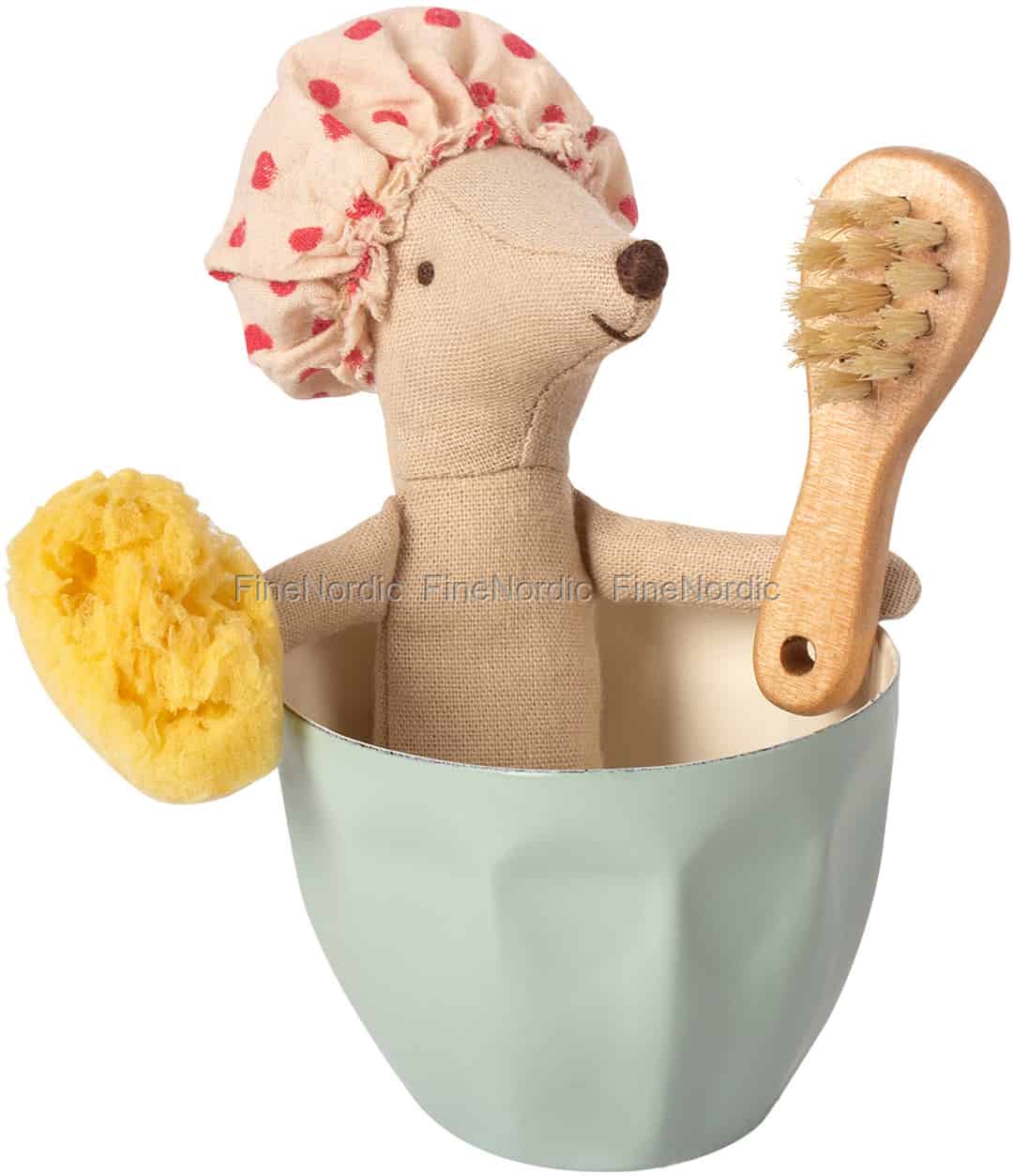 Sogar Mäuse nehmen ab und zu mal ein Bad. Schauen Sie sich nur diese Große Schwester Maus von Maileg an. Mit ihrem Luffa Schwamm und der Bürste wird sie quietsche-sauber, aber die Ohren bleiben dank ihrer gepunkteten Duschhaube trocken. Sie ist eine clevere kleine Maus, denn sie benutzt einen lackierten Metallbecher als ihre Wanne. Nach dem glücklichen Lächeln auf dem Gesicht der Großen Schwester zu urteilen, genießt sie ihren Spa & Wellness-Tag wirklich sehr.