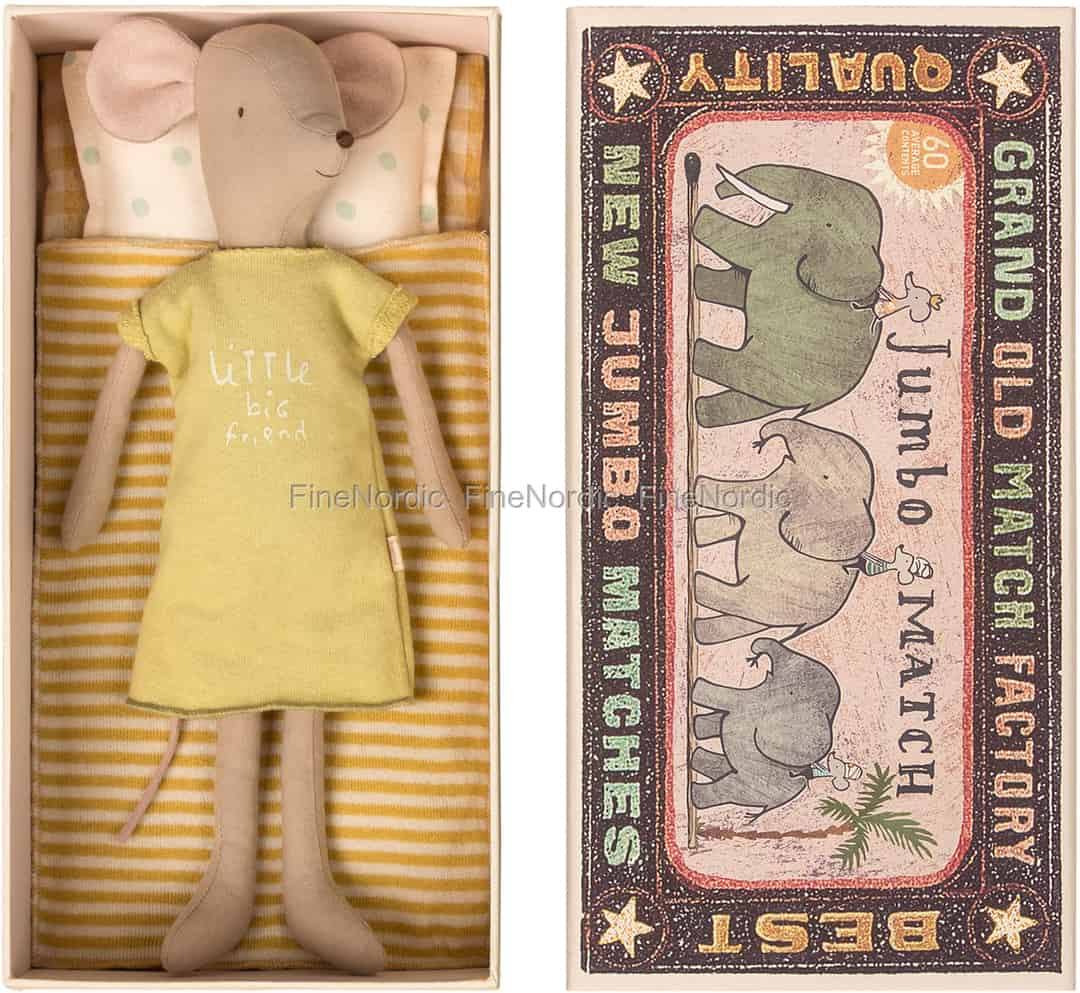 Dieses entzückende Mäusemädchen trägt ein niedliches gelbes Nachthemd und wird in einer Maileg Streichholzschachtel mit gestreifter Bettwäsche und gepunktetem Kissen geliefert. Dieses Medium Maileg Mäuschen liegt so bequem in ihrer Jumbo Streichholzschachtel, dass das Aufstehen bestimmt keine leichte Aufgabe sein wird. Jetzt streckt sie sich und gähnt und blinzelt verschlafen aus ihren kleinen Mäuseäuglein. Aber nur kurz darauf springt sie aus ihrer Box und ist bereit zum Spielen und Spaß zu haben! Kennen Sie vielleicht einen kleinen Jungen oder ein kleines Mädchen, das gerne mit dem Mäusemädchen spielen würde?