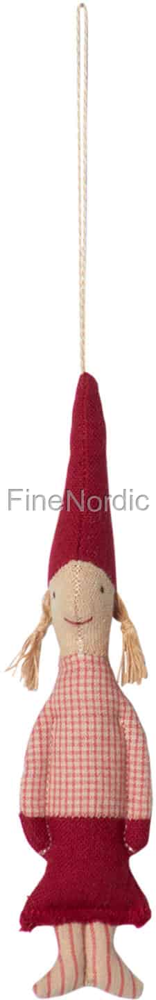 Was für ein entzückenden kleines Weihnachtsornament! Das Micro Weihnachtswichtel Mädchen 2016 von Maileg sieht von der Spitze ihres roten Wichtelhutes bis runter zu ihren gestreiften Füßen einfach super niedlich aus. Sie hat ihr Haar zu zwei Zöpfen geflochten und trägt ein breites Lächeln im Gesicht. Sie hat ein kariertes Top an und trägt dazu einen einfarbigen roten Rock. An der Spitze Ihres Wichtelhutes ist eine Schnur befestigt. Sie können sie damit an den Weihnachtsbaum, ein Weihnachtsgeschenk oder an ein paar Tannenzweige hängen. Wir glaube sie wird überall bezaubernd aussehen, egal wo Sie sie anhängen werden. Sie ist auch eine schöne Dekoration für ein Kinderzimmer zur Weihnachtszeit.