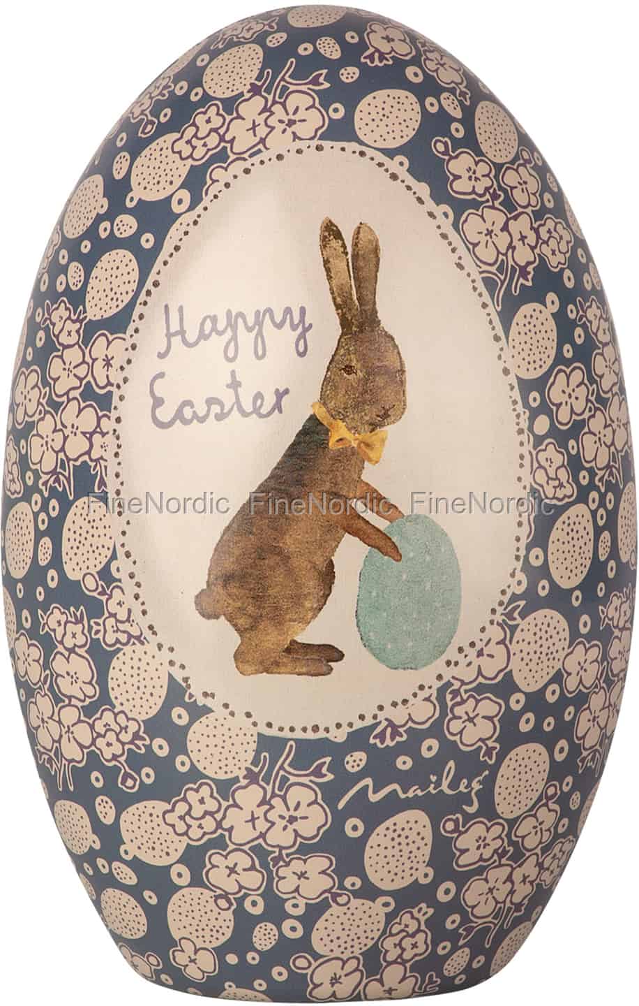Was für ein wunderschönes Osterei dieses blaue Maileg Ei doch ist! Das Metall Ei ist mit einem hübschen Eier- und Blumenmuster bedeckt und auf der Vorderseite des Eies sieht man einen Hasen, der ein Osterei festhält und über ihm kann man die Wörter: „Happy Easter“ lesen. Es ist ein wunderbares Geschenk für die Gastgeberin, wenn Sie zu einem Osterbrunch eingeladen werden. Das Beste daran ist, dass Sie dieses 13,5 cm große Ei öffnen und ein paar süße Leckereien hinzufügen können, bevor Sie es verschenken. Das Maileg Ei kann auch als hübsche Osterdekoration auf einem Regal oder Tisch dienen.