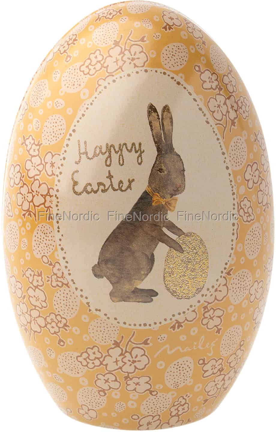 In diesem Happy Easter Osterei von Maileg können Sie ein paar süße kleine Überraschungen verstecken. Das gelbe Ei kann nämlich geöffnet werden, sodass Sie Ostersüßigkeiten oder ein kleines Geschenk hineinlegen können. Somit können Sie sich jetzt schon auf das überraschte Gesicht freuen, wenn der Beschenkte bemerkt, dass das Ei zu öffnen geht und das dort ein extra Geschenk auf ihn wartet. Dieses Metallei ist wunderschön mit Blumen, Ostereiern und einem Osterhasen dekoriert, der Ihnen frohe Ostern wünscht. Es ist eine hübsche Osterdekoration sowie auch eine charmante Geschenkbox für ein paar Scheine Geld oder eine Geschenkkarte. Wir bieten das Metallei auch in vier anderen Versionen in unserem Webshop an.