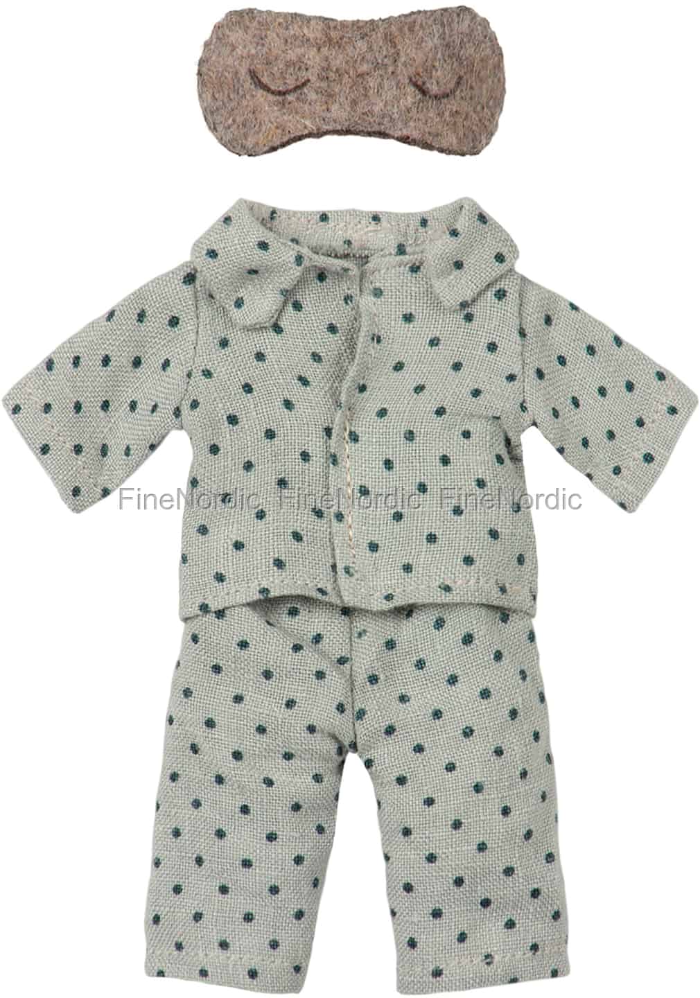 Sogar ein vielbeschäftigter Mäuse Papa muss mal ein paar Stunden schlafen können! Und wenn er sich fürs Bett fertig macht, dann trägt er am liebsten seinen bequemen und weichen Pyjama von Maileg. Jede Nacht sorgt er dafür, dass der Mausvater bestens schläft, damit er für den nächsten Tag gut ausgeruht ist. Nachdem er dieses gepunktete Pyjamaoberteil und -unterteil einige Male getragen hat, kann er es bei 30 ° C in der Waschmaschine waschen und schon kann er es am Abend wieder anziehen. Dieses Set enthält auch eine Schlafmaske, sodass der Mausvater auch nach Sonnenaufgang noch eine Weile länger schlafen kann.