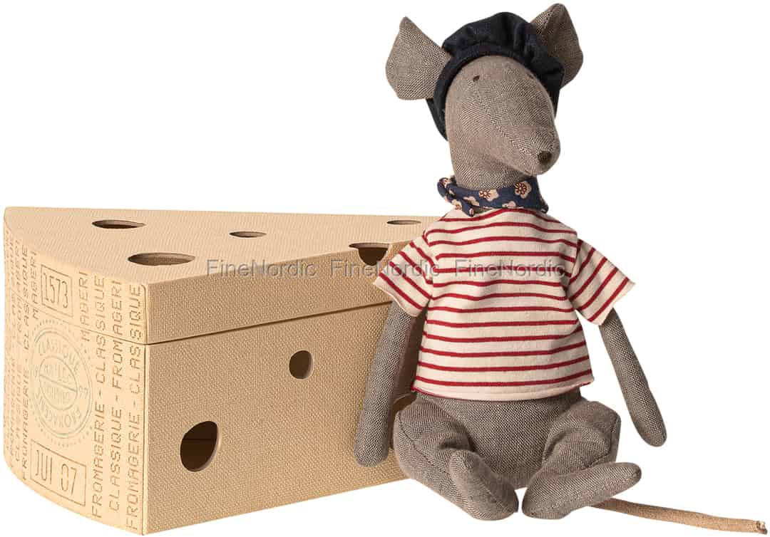 Bonjour Monsieur Ratte, na Sie haben es aber sehr gemütlich in Ihrer Käseschachtel! Mailegs Graue Ratte ist in französisch inspirierten Kleidern gekleidet und sie lebt in ihrer eigenen Käseschachtel. Nachts schläft die Ratte dort, versteckt sich darin, wenn sie Angst hat, und lunzt von dort aus gerne mal durch die kleinen Käselöcher um zu sehen, was sich alles um sie herum abspielt. Ab und zu hängt Monsieur Ratte auch mal mit seinem hellgrauen Rattenfreund ab. Dann diskutieren sie darüber, von wo sie die leckersten Croissants und den köstlichsten Fromage ergattern können. Die Maileg Ratte in Grau in der Käseschachtel ist ein bezauberndes Geschenk für einen kleinen Lieblingsmenschen.