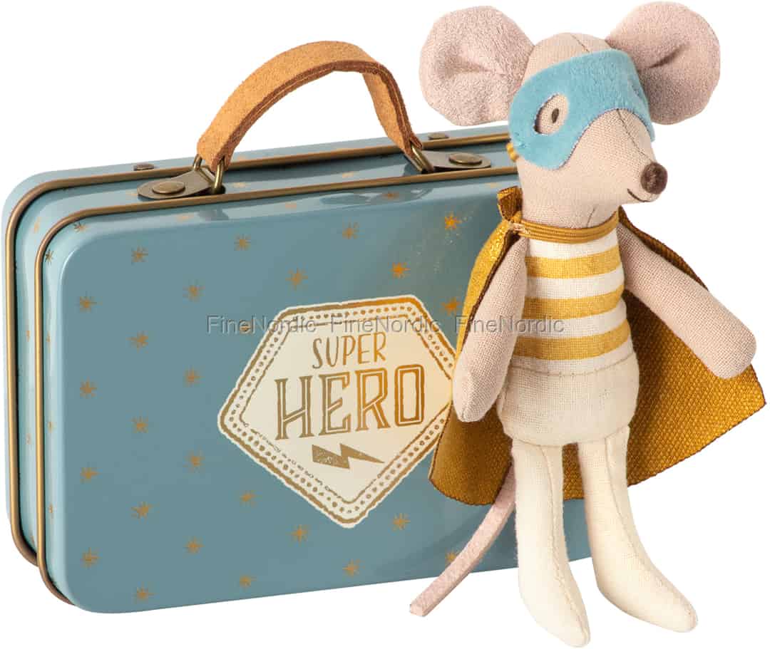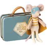 Die kleiner Bruder Superheld Maus von Maileg schläft gern und sie ruht sich am liebsten in ihrem Koffer aus, wenn sie nicht gerade damit beschäftigt ist, die Welt zu retten. Ihr Metallkoffer ist mit glänzenden goldenen Sternen und einem Superhelden Emblem verziert. Der charmante kleine Maileg Mäuserich trägt seinen Superheldenumhang und seine Maske. Dieses Stofftier weckt die Fantasie eines jeden Kindes und kann sich somit viele spannende Abenteuer einfallen lassen. Vielleicht kennen Sie einen kleinen Jungen oder ein kleines Mädchen, das gerne mit dieser Superheld Maus spielen würde?