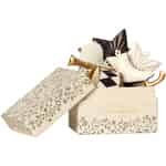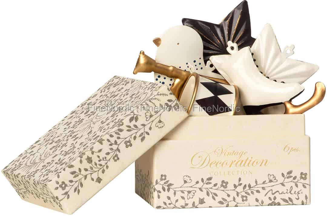 Nehmen Sie doch mal den Deckel dieser Kartonpapier Box hoch und sehen Sie sich den fantastischen Inhalt an. Lauter Weihnachtsschmuckartikel aus Metall in den klassischen Farben Anthrazit und Gold finden Sie darin. Sie sind wunderbare Dekorationen für die Weihnachtszeit. Hängen Sie sie an den Weihnachtsbaum, fügen Sie sie zu ein paar Tannenzweigen in einer Vase hinzu oder befestigen Sie sie an den Weihnachtsgeschenken. Dieses Set enthält: eine Turteltaube, zwei Sterne in jeweils heller und dunkler Farbe, eine Trompete, eine Trommel und einen Schlittschuh. Alle sind ganz einfach an ihrem angebrachten Band aufzuhängen. Diese mit Maileg 2019 Ornamenten gefüllte Geschenkbox ist auch eine schöne Geschenkidee für einen Maileg Fan.