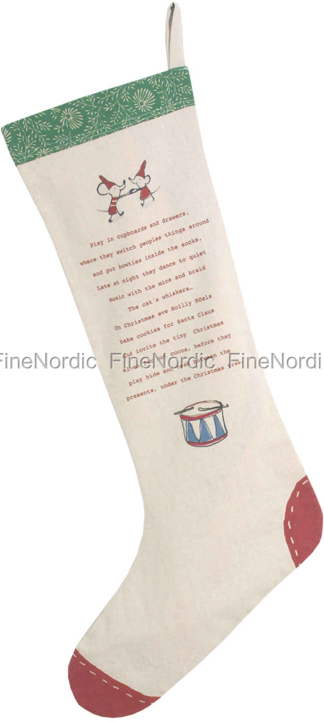 Mailegs bedruckter Weihnachtsstrumpf mit grünem Rand ist eine wunderschöne Weihnachtsdekoration. Auf ihm ist eine Trommel und zwei Mäuse, die aussehen als würden sie tanzen, abgebildet. Dazwischen steht etwas über schelmische Wichtel geschrieben. Der Strumpf hat einen grünen Rand und ist an der Ferse und in Zehenbereich rot. Sie können ihn an seinem kleinen Aufhänger anhängen und mit kleinen Leckereien befüllen. Er ist nicht nur eine schöne Dekoration für Ihr Zuhause, sondern auch ein schönes Geschenk für einen geliebten Menschen.