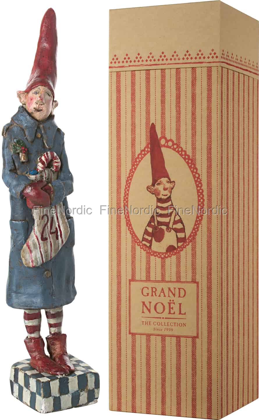Der Grand Noël Nr. 7 Weihnachtswichtel ist eine wunderbare Ergänzung für Ihre Maileg Weihnachtswichtelsammlung. Die 30 cm hohe Figur ist ein weiteres Meisterwerk aus dem Hause Maileg. Mit rotem Wichtelhut, blauem Mantel und roten Stiefeln steht der Wichtel da und mit seinen, in rote Handschuhe gepackten Hände, hält er einen Weihnachtsstrumpf ganz fest vor seinen Bauch gedrückt, so das nichts rausfallen kann. Der gestreifte Weihnachtsstrumpf mit einer roten 24 bemalt, scheint ganz vollgepackt zu sein und oben guckt eine rotgestreifte Zuckerstange heraus. Seinen Mantel hat er mit einer fruchtenden Stechpalme feierlich geschmückt, denn er befindet sich gerade auf dem Weg zum Weihnachtsfest. Das will er zusammen mit seinen Wichtelfreunden feiern. Er freut sich schon auf das leckere Essen und er hofft, dass die Geschenke in seinem Strumpf seinen Freunden gefallen werden. Frohe Weihnachten, Grand Noël Nr. 7!