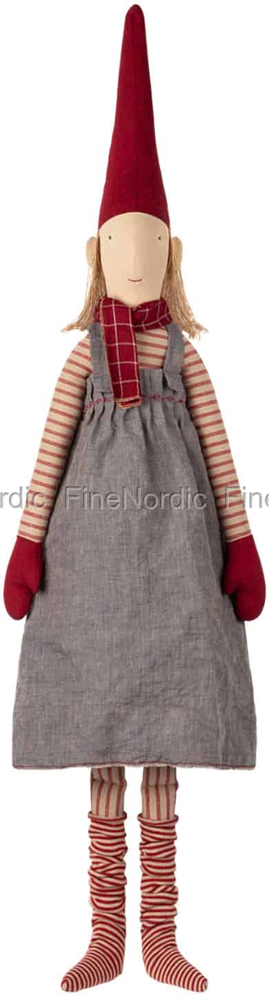 Mailegs Weihnachtswichtel Mega Pixy Helen 2018 ist schon wirklich eine imposante Figur in Kinderzimmer. Die über 1 m große Helen ist ein wahrer Blickfang, wenn sie in Kinderzimmer auf einem Stuhl sitzt. Hübsch gekleidet ist sie auch, von ihrer schicken roten Wichtelmütze bis runter zu den rotgestreiften Strümpfen. Sie trägt ein gutaussehendes Trägerkleid und um den Hals hat sie einen roten, karierten Schal gewickelt. Die Wichteldame kann sich wirklich sehen lassen, aber alles was sie will, ist mit einem kleinen menschlichen Freund zu spielen, spielen, spielen. Am allerliebsten spielt sie Verstecken, was bei ihrer beachtlichen Größe gar nicht so einfach ist. Und wenn es abends an der Zeit ist in die Heia zu gehen, dann kuschelt sie gerne noch mit ihrem menschlichen Freund und erzählt ihm Gute-Nacht-Geschichten. Der Mega Weihnachtswichtel Helen 2018 von Maileg ist ein schöner Spielgefährte und treuer Wegbegleiter für ein Kind.