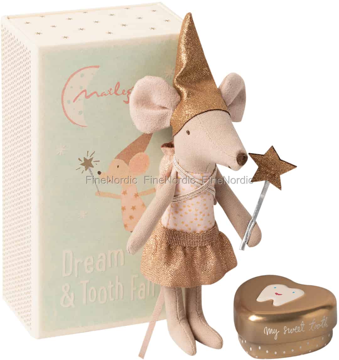 Wenn der erste Zahn zu wackeln anfängt, dann ist es bald an der Zeit, dass die Zahnfee einen Besuch abstattet. Die große Schwester Zahnfee Maus von Maileg wird in einer hübsch dekorierten Streichholzschachtel und mit einer herzförmigen Zahndose geliefert. Auf dem Deckel der goldfarbenen Zahnbox ist ein Zahn abgebildet und die Worte My sweet tooth sind entlang der Seite des Deckels zu sehen. Die Maus trägt ein goldfarbenes Ballettröckchen und einen dazu passenden Feenhut sowie einen funkelnden Rucksack. Sie hält ihren Feenstab in der Hand, mit dem sie Feenstaub verstreut, wenn sie nachts zu Besuch kommt. Die große Schwester Zahnfee ist ein entzückendes Geschenk für einen kleinen Lieblingsmenschen. Die Zahnfee ist auch in einer Großer Bruder Version erhältlich.
