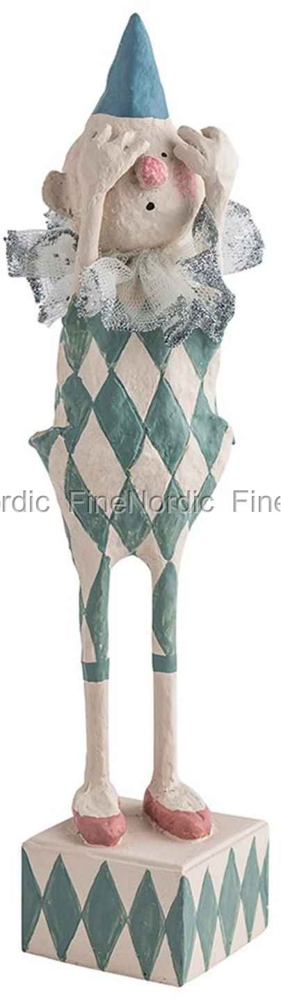 Diese Clown Figur See no Evil von Medusa-Copenhagen ist eine besondere Dekoration für das Zuhause. Der Clown trägt ein knielanges, einteiliges Outfit mit Harlekinmuster, einen Rüschenkragen und eine einfarbige Mütze. Er steht auf einer quadratischen Kiste, die an allen vier Seiten mit einem hübschen Harlekin-Muster geschmückt ist. Der Clown verdeckt seine Augen mit seinen Händen, um ja nichts Böses sehen zu müssen. Diese Figur ist 22 cm groß und kann einzeln gekauft werden, oder zusammen mit den Hear no Evil und Speak no Evil Figuren von Medusa-Copenhagen, die außerdem in unserem Webshop erhältlich sind.