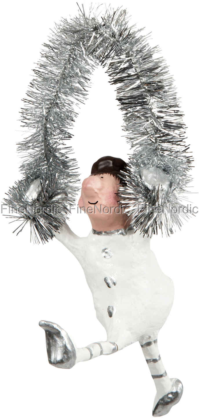 Silber Ella von Medusa-Copenhagen hängt gerne an ihrer silbernen Girlande. Mit einem hochgezogenen Bein versucht sie hin und her zu schaukeln. Sie ist bekleidet in einem weißen Outfit mit silbernen Knöpfen und sie hat silber-weiß gestreifte Strümpfe an. An den Füßen trägt sie silberne Schühchen und ihr Kopf ist mit einem schwarzen Hut bedeckt. Sie kann am Weihnachtsbaum, an ein paar Tannenzweigen oder an einem Haken oder Griff angehängt werden. Wenn Sie eine ungewöhnliche Art von Weihnachtsschmuck mögen, dann ist Silber Ella genau das Richtige für Sie. Gefällt Ihnen das Aussehen von Ella? Dann schauen Sie sich doch auch die anderen, von einer Girlande hängenden, Figuren von Medusa-Copenhagen an, welche wir außerdem in unserem Webshop anbieten.