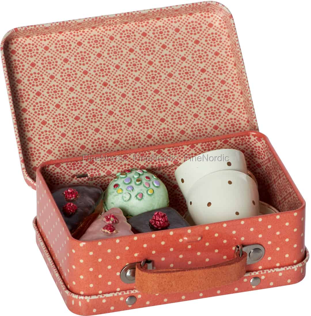 Einen Koffer, gefüllt mit so vielen Leckereien, das sieht man ja nicht jeden Tag. Der Maileg Metall Koffer mit 4 Cupcakes und 2 Tassen beherbergt eine zuckersüße Überraschung in seinem Inneren. Vier köstliche Gebäckstücke, dazu 2 Tassen mit Untertassen. Da bekommt man doch sofort Lust auf ein spontanes Picknick in Kinderzimmer. Schnell die Hasenfreunde zusammentrommeln, dann eine Decke in Zimmer ausbreiten, Kofferinhalt darauf verteilen und schon kann’s losgehen. Und kurz darauf hört man eifriges Geplapper und viel Gelächter aus dem Kinderzimmer. Maileg bedeutet nicht nur charmantes Design und Produkte die mit viel Liebe zum Detail hergestellt wurden, Maileg sorgt auch dafür das die Fantasie der Kinder angeregt wird und in der Mailegwelt, darf ein Kind einfach nur ein Kind sein.