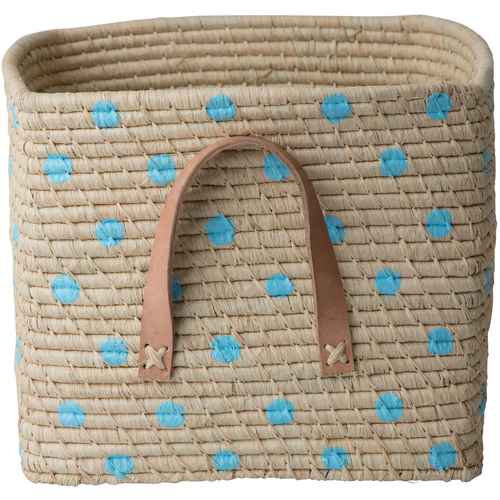 Rice Raffia Korb - Quadratisch - Gemalt Blue Dots and Ledergriffen - Klein