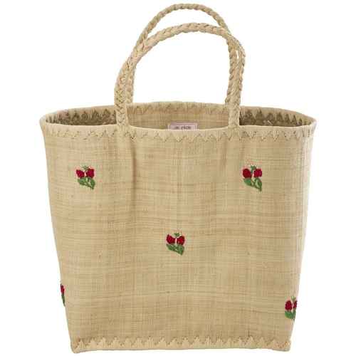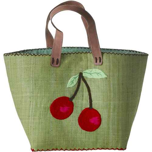 Rice Raffia Tasche - Pastell Grün - Kirsche Bestickt - Groß