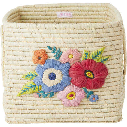Rice Raffia Korb - Quadratisch - Hand Embroidered Flowers - Natural