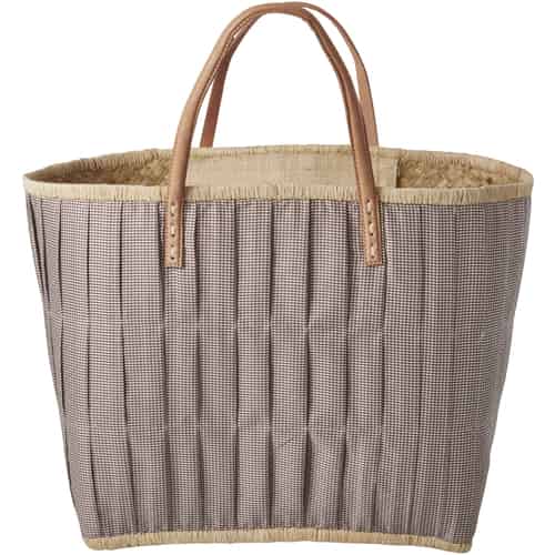 Rice Raffia Einkaufstasche - Stoffbezogen - Ledergriffe - Braun Kariert - Groß