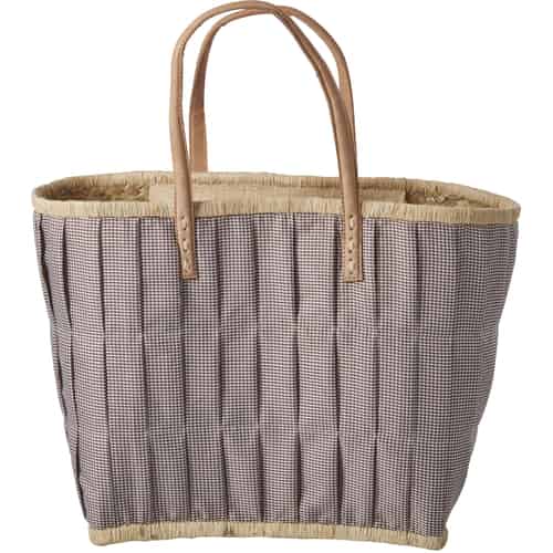 Rice Raffia Einkaufstasche - Stoffbezogen - Ledergriffe - Braun Kariert - Medium