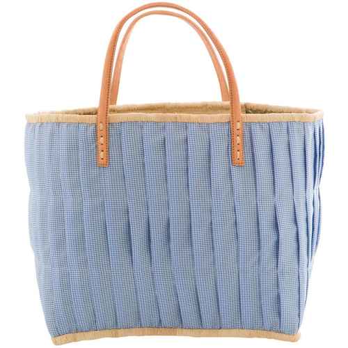Rice Raffia Einkaufstasche - Stoffbezogen - Ledergriffe - Light Blue Check - Groß