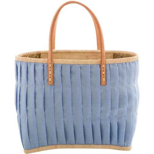 Rice Raffia Einkaufstasche - Stoffbezogen - Ledergriffe - Light Blue Check - Medium