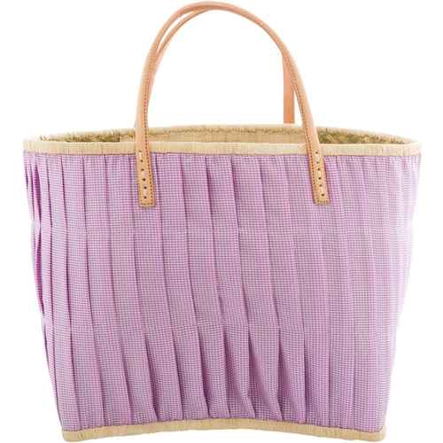 Rice Raffia Einkaufstasche - Stoffbezogen - Ledergriffe - Lavender Kariert - Groß