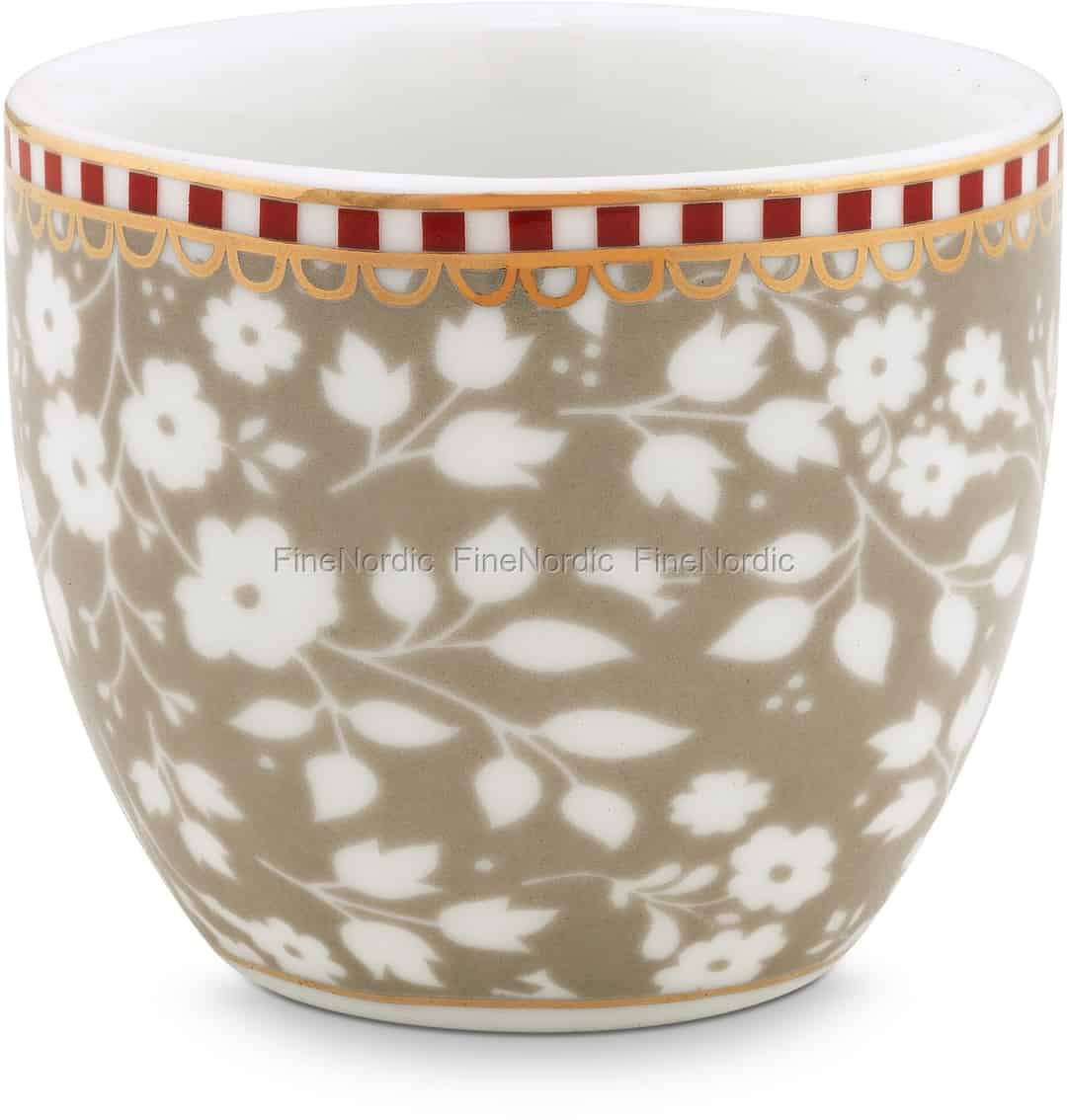 Decken Sie den Frühstückstisch mit diesem entzückenden Eierbecher von Pip Studio ein. Der Lovely Branches Khaki Eierbecher ist Teil der Pip Studio Floral Kollektion und ist dezent mit lieblichen Zweigen auf Khaki Hintergrund geschmückt. Entlang der oberen Kante sehen Sie die markante rot-weiß gestreifte Linie von Pip Studio mit goldenen Details. Der Eierbecher hat einen Durchmesser von 4,5 cm und ist aus hochwertigem Porzellan gefertigt. Stellen Sie den Pink Lovely Branches und Blue Lovely Branches Eierbecher mit auf den Tisch, als bunte und interessante Tischdekoration. Der Eierbecher Khaki Lovely Branches lässt sich gut mit den anderen Khaki Floral Geschirrteilen von Pip Studio kombinieren. Dieser Eierbecher ist auch ein nettes kleines Gastgeschenk oder aber ein Überraschungsgeschenk für einen Pip Studio Sammler.