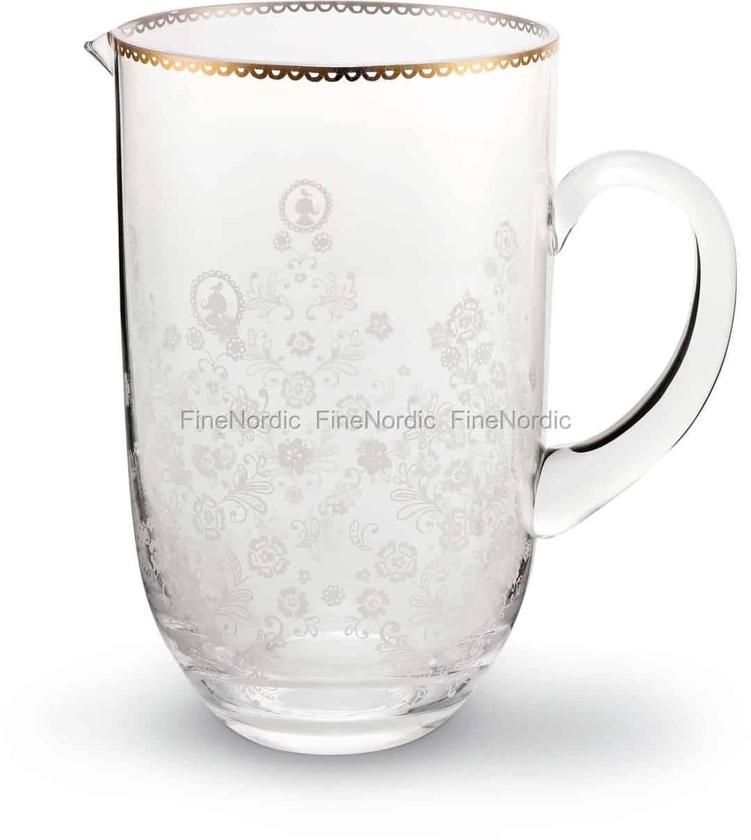 Was gibt es Schöneres an einem heißen Sommertag, als seinen Durst mit eiskaltem Wasser zu löschen? Servieren Sie es stilvoll mit diesem Wasserkrug von Pip Studio. Er besteht aus durchsichtigem Glas, das wunderschön mit spielerischen Akzenten und dem Pip Logo verziert ist. Der obere Rand der Kanne ist mit einer luxuriösen goldfarbenen Kante eingefasst. Die Kanne hat ein Fassungsvermögen von 1700 ml und ist durch den großen Griff super leicht zu halten und zu tragen. Wenn Sie das Aussehen und das Design dieser Kanne mögen, dann schauen Sie sich doch bitte auch die passenden Gläser aus der Floral Kollektion von Pip Studio an. Diese können sie alle gleich hier in unserem Webshop entdecken.